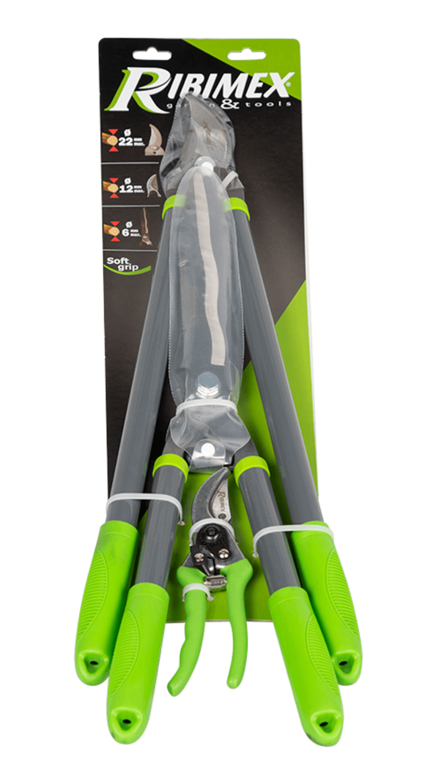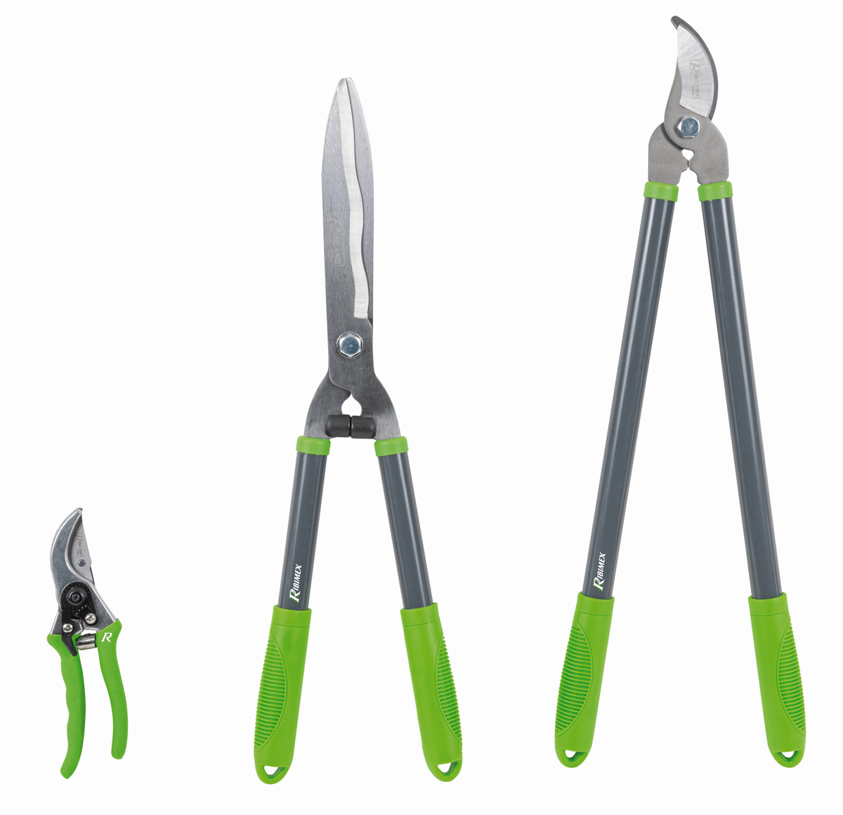 Lot de 3 coupants avec poignées antiglisse en PVC. - 1 Cisaille à haies à lames droites (550 mm). Lames : 200 mm, épaisseur : 4 mm. Pièce entière en acier carbone #55 à surface polie mécaniquement. Butées d amortissement de coupe. Manches tubulaires : 240 mm. Diamètre de coupe maxi : 6mm. - 1 Coupe-branche (± 580 mm). Lame et contre-lame en acier carbone épaisseur : 4 mm. Manches tubulaires : 440 mm. Lame en acier carbone traité HRC 50-54. Diamètre de coupe maxi : 22mm. - 1 Sécateur 8". Lames courbes en acier carbone. Système de blocage en position
