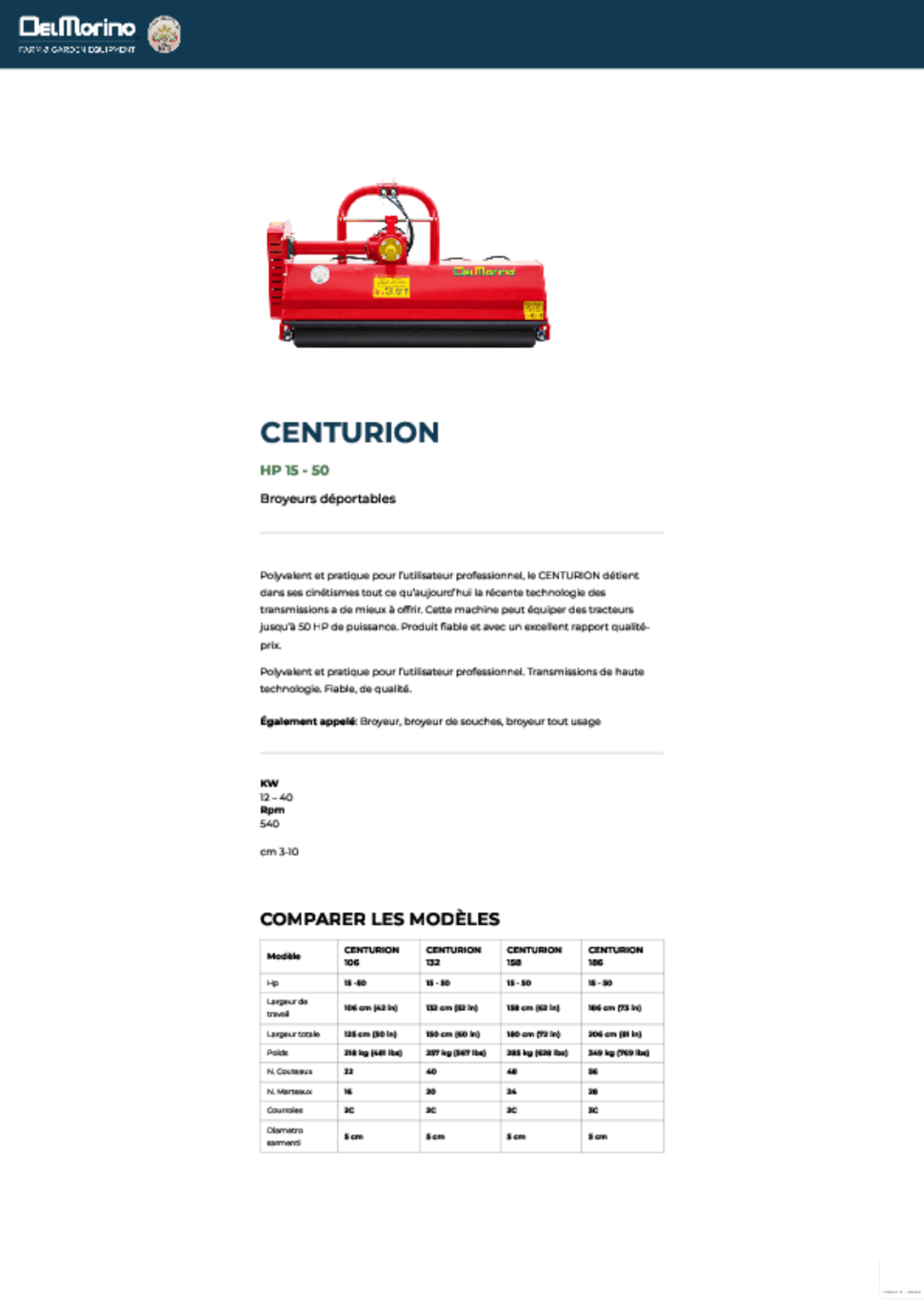Equipement standard : - Attelage à 3 points catégorie 1 - Boitier en fonte 540 t/min avec roue libre.