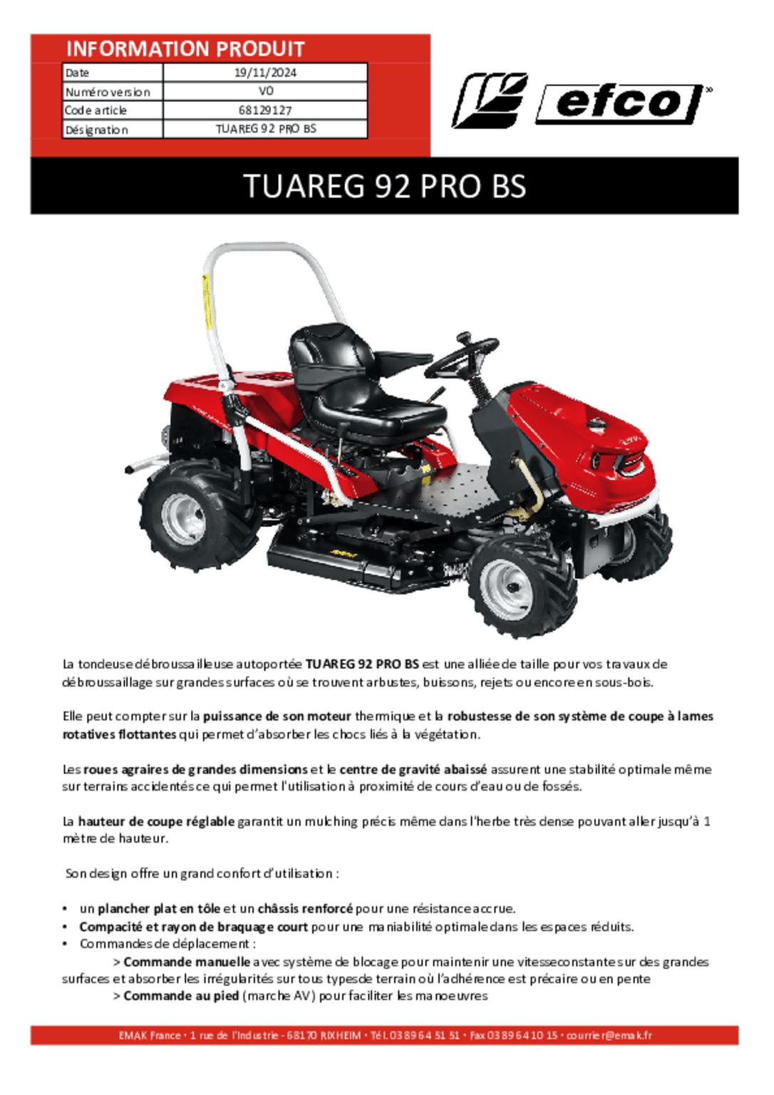 Carter de tonte : acier. Largeur de coupe : 92 cm.
