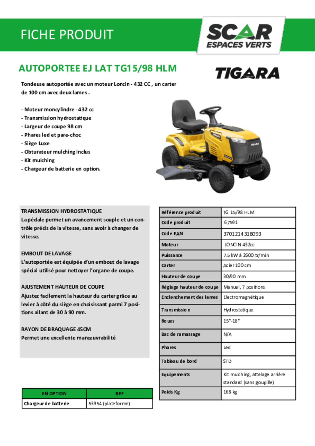 - Tondeuse autoportée à éjection latérale TG 15/98 HLM