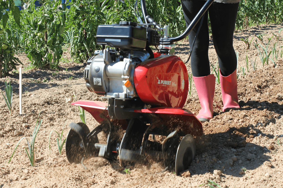 Moteur PUBERT R80. 79 cc. 1 vitesse AV et 1 AR. 4 fraises Ø 285 mm. Roue AV escamotable. Béquille de terrage.
