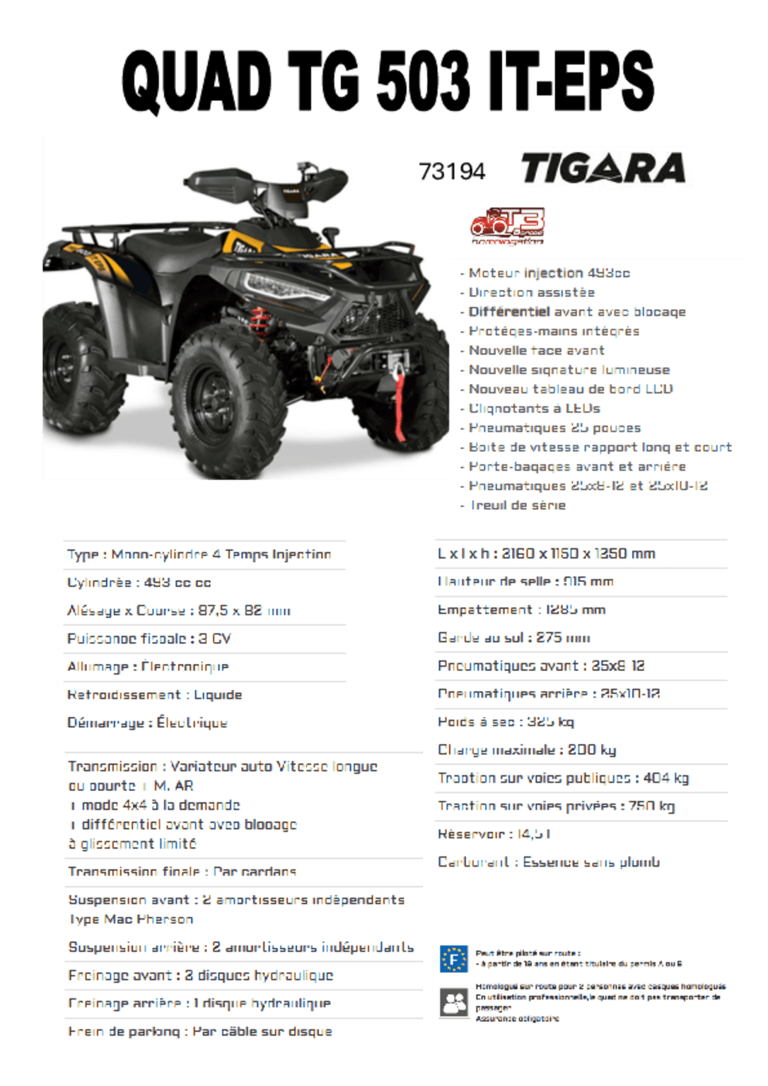 Transmission : variateur automatique, vitesse longue, vitesse courte, marche arrière. Mode 4x4 à la demande par commande électrique, différentiel avant avec blocage à glissement limité Finale.