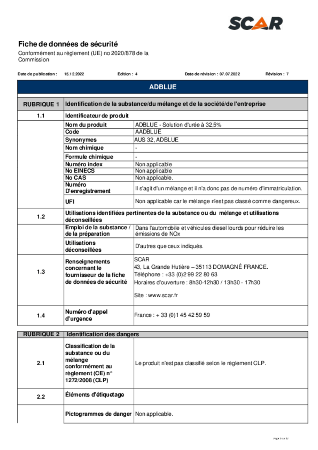 AdBlue. Solution d'eau et d'urée (contenant de l'ammoniac). Dépolluant gasoil pour tous les véhicules Diesel équipés de système de post-traitement SCR (Selective Catalytic Reduction). Fait l'objet de la dernière certification ISO 22241. Optimise la pulvérisation et évite la cristallisation et l'obstruction de système SCR. Conforme à la norme DIN 70070. Propriétés : réduction du taux d'émission des gaz polluants, amélioration des performances moteurs et diminution de la consommation de gazole. Bidon 25 L.