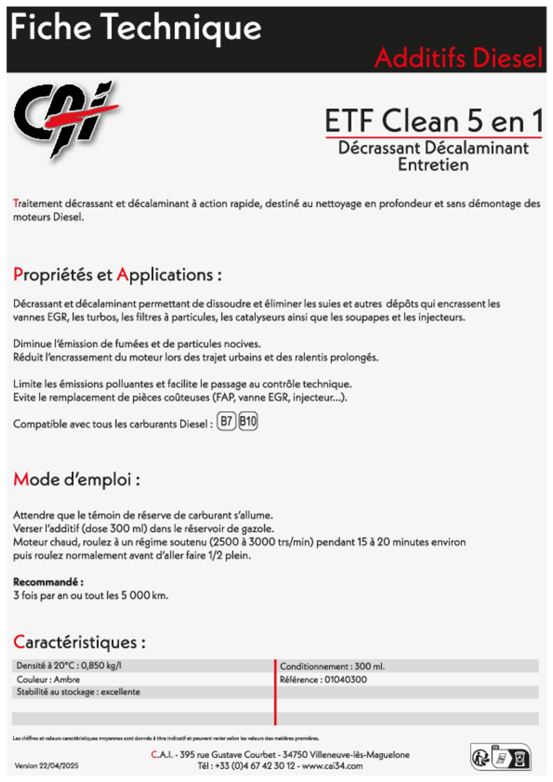 Nettoyant et décalaminant sans démontage, des vannes EGR, turbo, catalyseur et FAP des moteurs Diesel. Pour les moteurs Diesel, avec ou sans turbo. Utilisation en entretien périodique permettant d'améliorer l'éfficacité des systèmes embarqués de dépollution des véhicules Diesel légers. Compatible avec l'utilisation des systèmes de traitement post-combustion : FAP, SCR, catalyseurs. Nettoie et libère les turbos (commande de géométrie variable). Facilite et améliore les régénérations de FAP. Nettoie gommes, vernis et dépôts dans le circuit d'alimentation et d'injection. Améliore le flux sortant et favorise la combustion. Optimise la consommation et diminue la pollution. Flacon 300 ml.