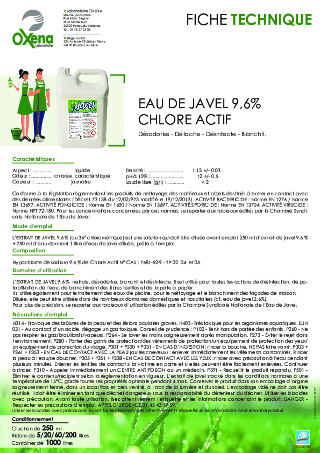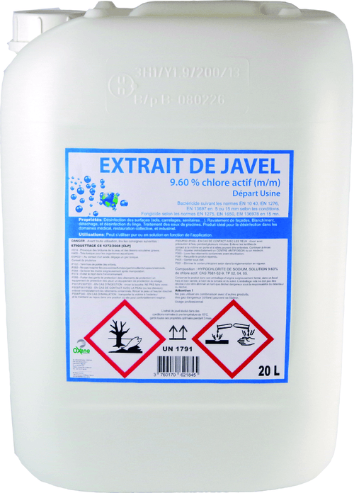 Pour obtenir 1 L d'eau de javel diluée, prête à l'emploi : 250 ml d'extrait d'eau de javel 9,6 % + 750 ml d'eau.