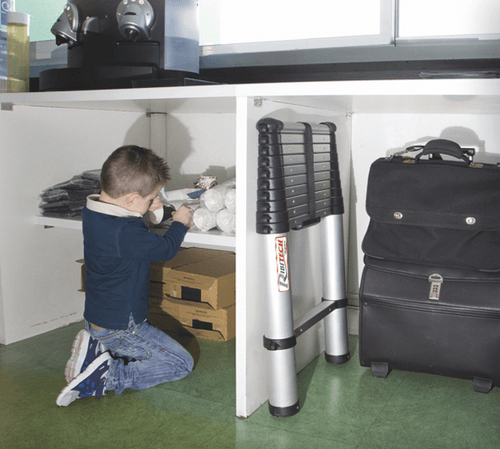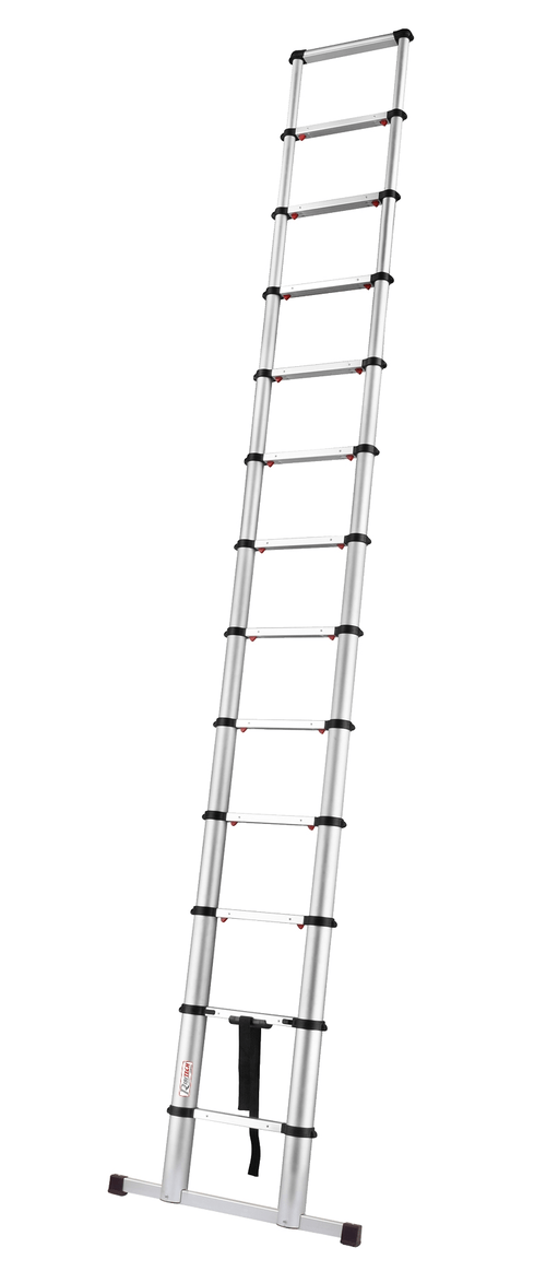 Echelle télescopique. Hauteur pliée : 1,01 m. Hauteur dépliée : 3,80 m. Largeur : 49 cm. Légère : 13 kg. Nombre d'échelons : 13. Charge max : 150 kg. Déploiement partiel ou total. Utilisation en intérieur et extérieur. Profil rectangulaire en aluminium avec rainurage antidérapant. Montants cylindriques coulissants en aluminium avec verrouillage automatique de sécurité sur chaque section. 2 leviers de déverrouillage pour chaque section. Conforme à la norme EN 131.