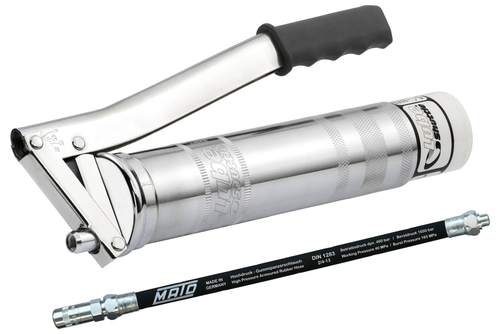 Tête en acier galvanisé. Poignée ergonomique, emballage carton écologique. Pression de service 400 Bar, haute pression jusquà 800 Bar. Flexible caoutchouc 2 tresses acier 300 mm, agrafe 4 mors. Pour cartouche à visser.