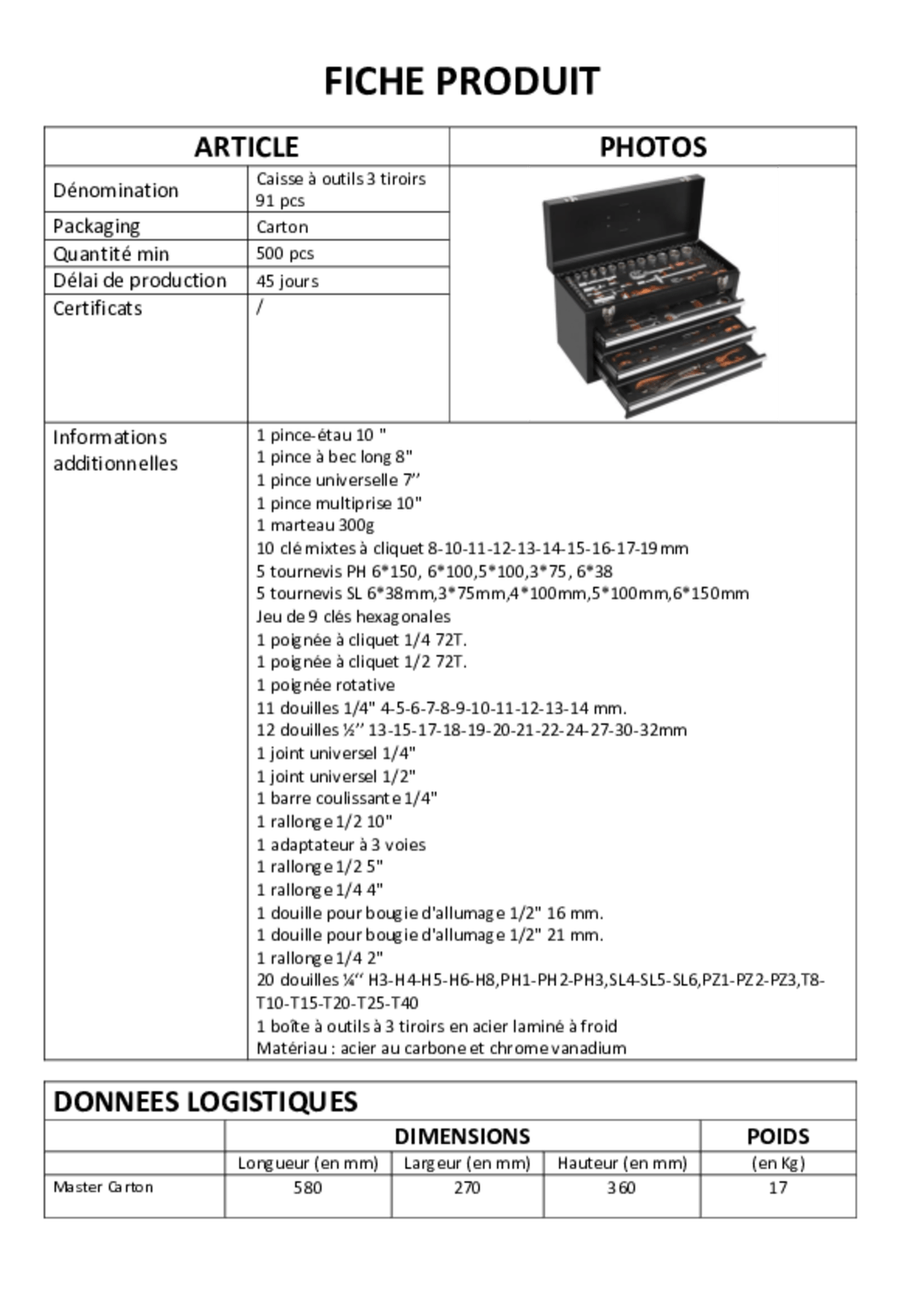 Caisse à outils à 3 tiroirs avec 91 pièces.