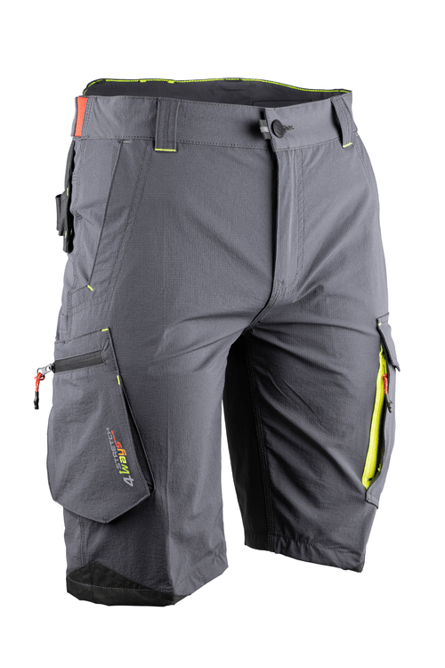 Gris nuit. Stretch anti UV. 90%, polyamide 10%, élasthanne 155 g/m2. Renforts : Oxford 300D imperméable 100% polyester - 175 g/m2. Ceinture composée de 5 passants + 1 passant dos large, avec réhausse lombaire, bande élastiquée antiglisse, et resserrable par pattes extensibles dos. Poches italiennes, poche cuisse gauche fermée par rabat et scratch, surpoche fermée par zip, poche cuisse droite à soufflet, fermée par zip, avec ouverture poche mètre, poche dos gauche à soufflet, avec rabat fermé par scratch. Support porte marteau semi volant en Oxford 300D, renfort bas de jambe en Oxford 300D - broderies devant et dos. Taille 38 à 54.