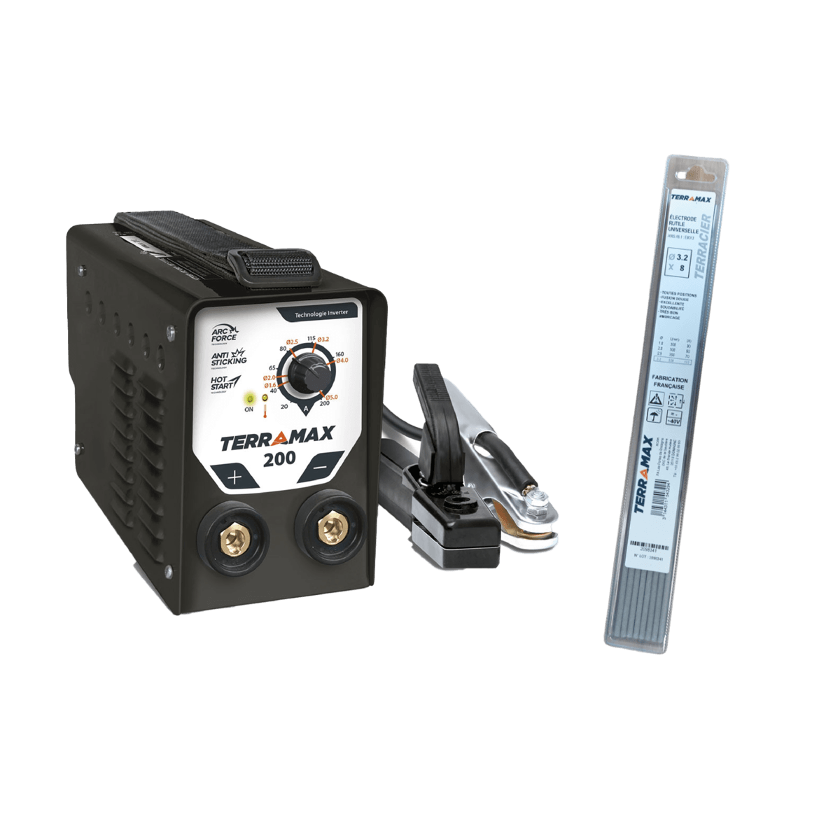 Soude facilement la plus grande majorité des électrodes enrobées (MMA). Compatible avec les électrodes de diamètre 1,6 à 5 mm. Technologie inverter : puissance de soudage constante pour des cordons réguliers. Fusion très douce due à son courant continu. Panneau de commande intuitif avec un seul potentiomètre pour régler l'intensité de soudage. Protection contre les surtensions jusqu'à 400 V. Adapté à l'utilisation sur groupe électrogène (10 kVA). Compact et léger. Alimentation monophasée 230 V - 32 A. Facteur de marche : 100 A à 60%, 80 A à 100%. Livré avec accessoires : câble de masse de 1,6 m, porte-électrode de 1,6 m. Boîte d'électrodes TERRACIER à enrobage rutile. Toutes positions. Universelle, polyvalente. Fusion douce et laitier d'enlèvement facile. Dimensions: 3,2 mm x 350 mm. Blister de 8 pièces.